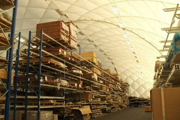 Die Andienung erfolgt stets ebenerdig und die Flächenausnutzung ist aufgrund der konkaven Geometrie ideal. Verschiedene Stapler- und LKW-Schleusen sind verfügbar. Das Beleuchtungskonzept wird exakt ihrer Nutzung angepasst. Unsere Anlagen pflegen sich leicht und unaufdringlich in Ihr Arbeitsumfeld ein.Hallengrößen von bis zu 200m x 200m sind realisierbar. Die einströmende Luft kann wahlweise beheizt, gekühlt, gefiltert sowie be- und entfeuchtet werden. Das innere Klima der Traglufthalle kann individuell und nutzungsspezifisch gesteuert werden um so otimale Lagerbedingungen zu schaffen.