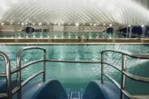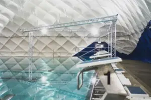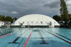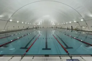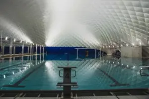 Überdachung einer Badeanstalt, um ein ganzjähriges Schwimmtraining im Außenbecken zu ermöglichen